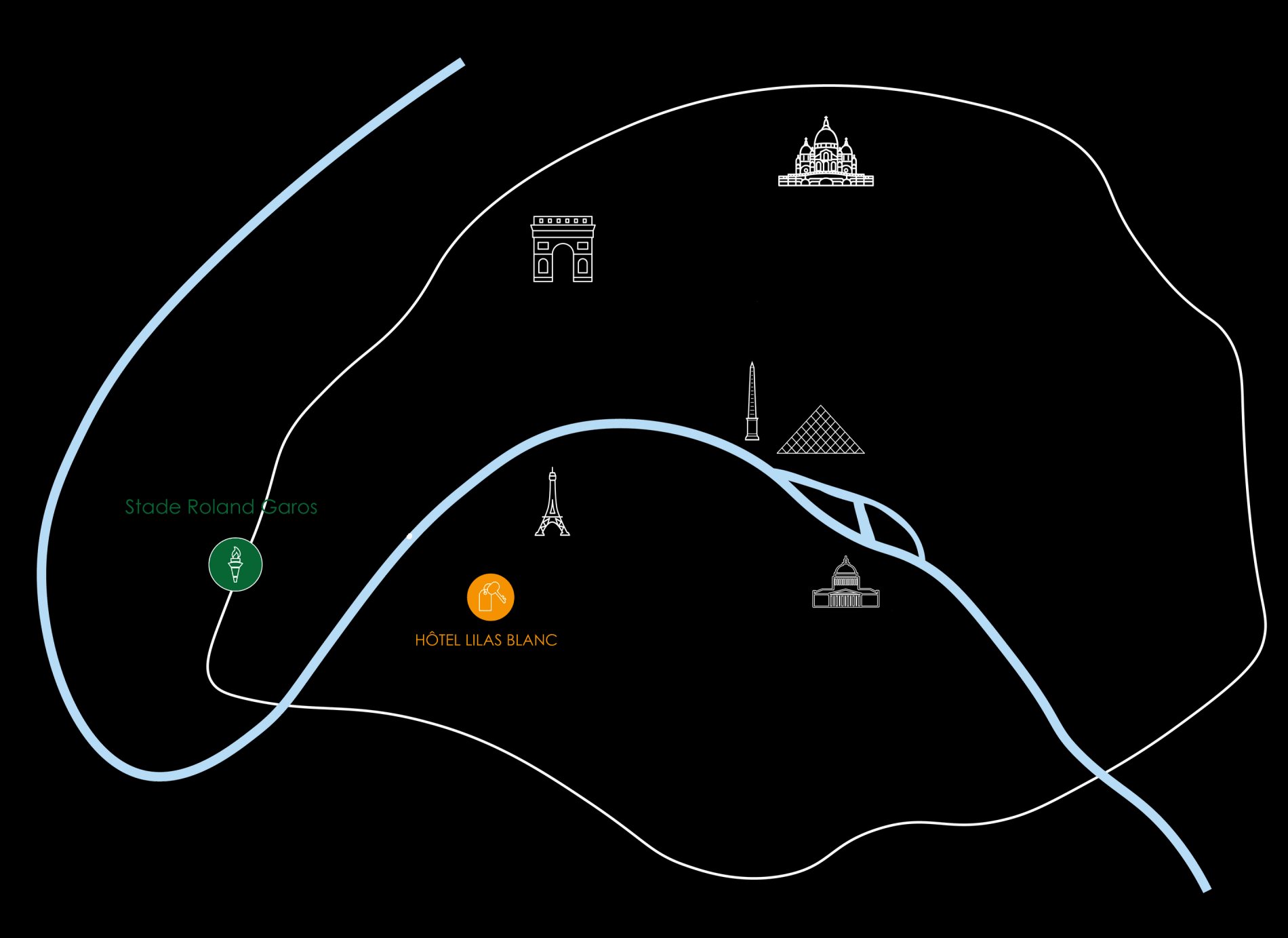 Station Vélib' à 2 minutes de l'hôtel. Longer le quai de Javel, traverser le Pont du Garigliano, rejoindre le Bois de Boulogne et rouler jusqu'aux grilles du stade Roland-Garros. Une parenthèse verdoyante avant l'intensité des courts.